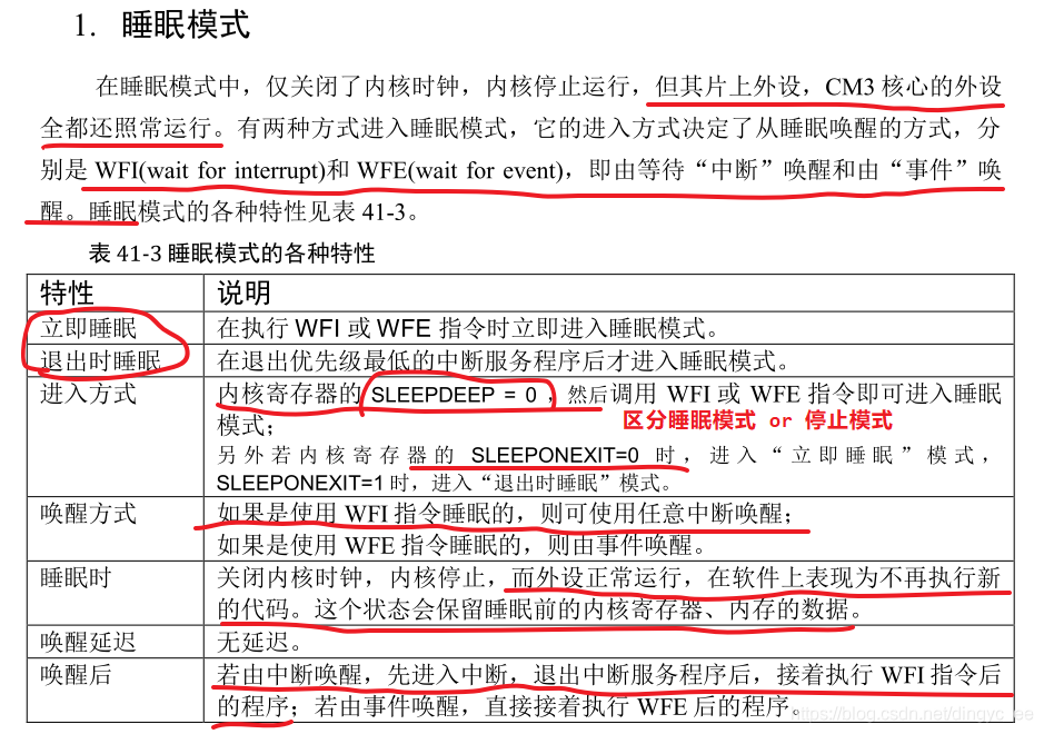 睡眠模式下,任何中断都可以唤醒内核,外部 / 内部高速时钟保持打开,调压器保持打开,因此,内核只要被唤醒,就能马上正常的执行程序(优点:响应速度快;缺点:功耗比较大);
