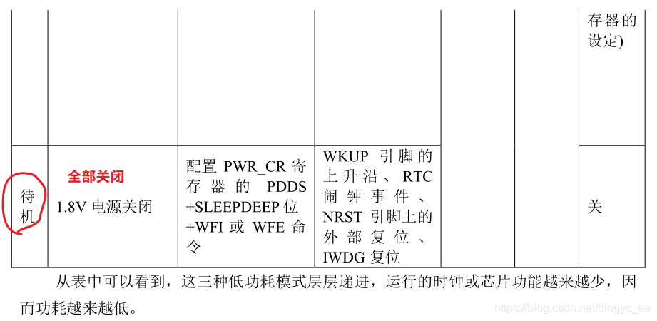 待机模式下,整个1.8V供电区域被关闭,调压器被关闭,只能特定方式唤醒。唤醒之后程序从最开始(启动文件)执行(优点:功耗最低;缺点,每次都是复位执行);