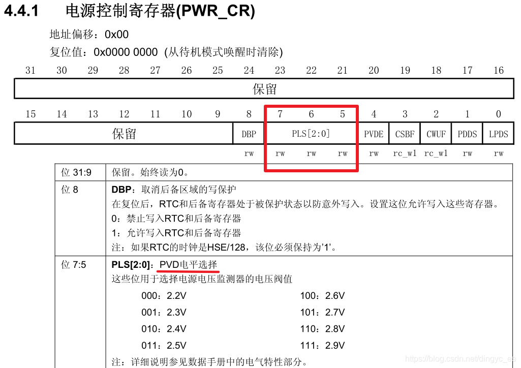 1 配置PVD检测函数 PWR_PVDLevelConfig ,其实就是写入PWR_CR寄存器的这几位:
