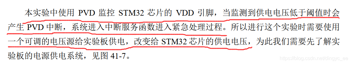 实际上,PVD监测的是VDD的电压,也就是stm32的供电电压。当我们调节(降低VDD电压)时,PVD一旦监测到小于设置的阈值,就会产生PVD中断。