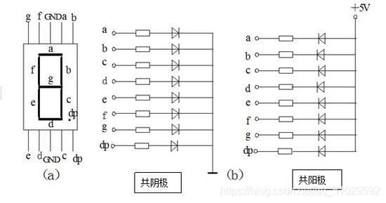 一个八段数码管由八段二极管组成即a,b,c,d,e,f,g,dop(点),共八段。其中数码管分两种,共阴极和共阳极(共阳极:数码管的阳极全部接在一起,低电平点亮它,如果是共阳极,低电平点亮它。)