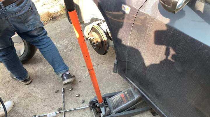 我们来看下如何用示波器测量汽车车速传感器信号,首先把千斤顶放置在稳固的水平地面上,将车辆的驱动轮举起来,卸下车轮。