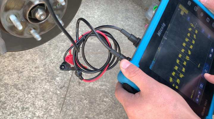 给示波器的任意通道接上一根BNC转香蕉头线,红色香蕉头和黑色香蕉头各接一根刺针。可以看到车轮上有一根线束,线往上走连接的就是传感器。将红色刺针刺入传感器的信号线,黑色刺针刺入传感器的接地线。