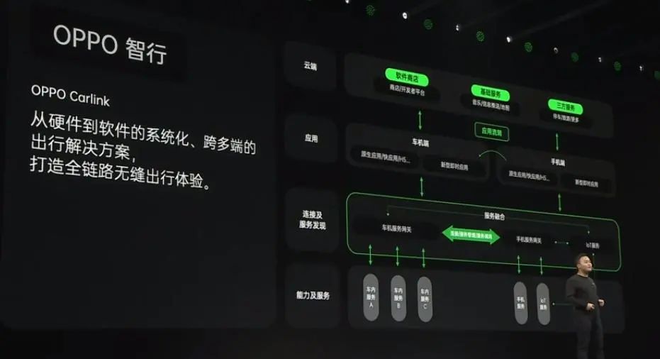 根据官方介绍,OPPO智行解决方案,将具备从硬件到软件的系统化、跨多端的特点。在云端,OPPO智行将提供软件商店和开发者平台、音乐/信息推送/地图基础服务,以及停车/旅游等更多第三方服务。在应用端,OPPO智行将支持手机和车机、车机多屏之间的应用流转。
