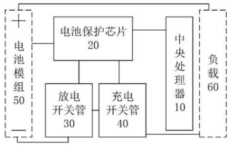如上图,为该专利中发明的动力电池保护板的结构示意图,该电路保护板主要包括:中央处理器10、电池保护芯片20、放电开关管30和充电开关管40。其中,电池保护芯片分别与中央处理器、电池模组的状态检测端、放电开关管的第一端以及充电开关管的第一端相连接,同时,放电开关管的第二端、第三端分别与电池模组的负极、充电开关管的第二端相连接,充电开关管的第三端与负载的第一端相连接。