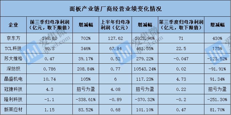 整体来看,随着面板报价下跌,面板厂商及产业链企业的经营业绩也受到较大的影响。相较于上半年,大部分厂商Q3归母净利润增幅出现收窄或者下滑的局面。
