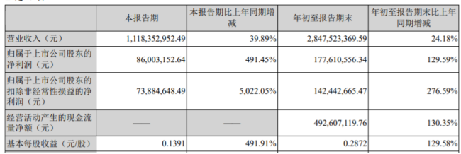第三季度公司实现营业收入11.18亿元,同比增长39.89%。实现归属于上市公司股东的净利润8600万元,同比增长491.45%。实现基本每股收益0.1391元,同比增长491.91%。