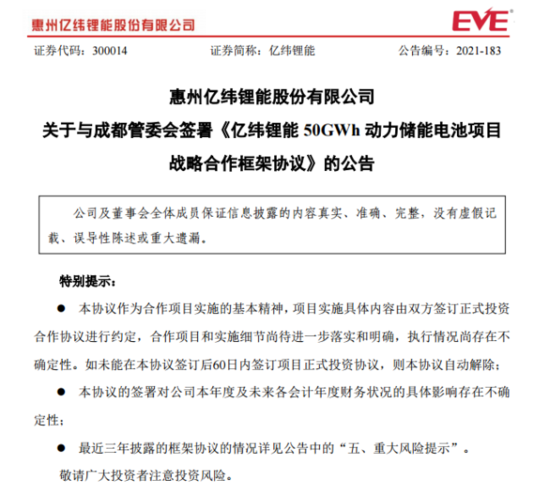 10月29日晚间,亿纬锂能披露公告,公司与成都经济技术开发区管理委员会于2021年10月27日签署《亿纬锂能50GWh动力储能电池项目战略合作框架协议》,双方拟发挥各自优势,在锂离子电池生产和研发领域开展良好合作,就公司在成都经济技术开发区管理委员会所辖区域内新征土地建设“亿纬锂能50GWh动力储能电池项目”达成相关约定。