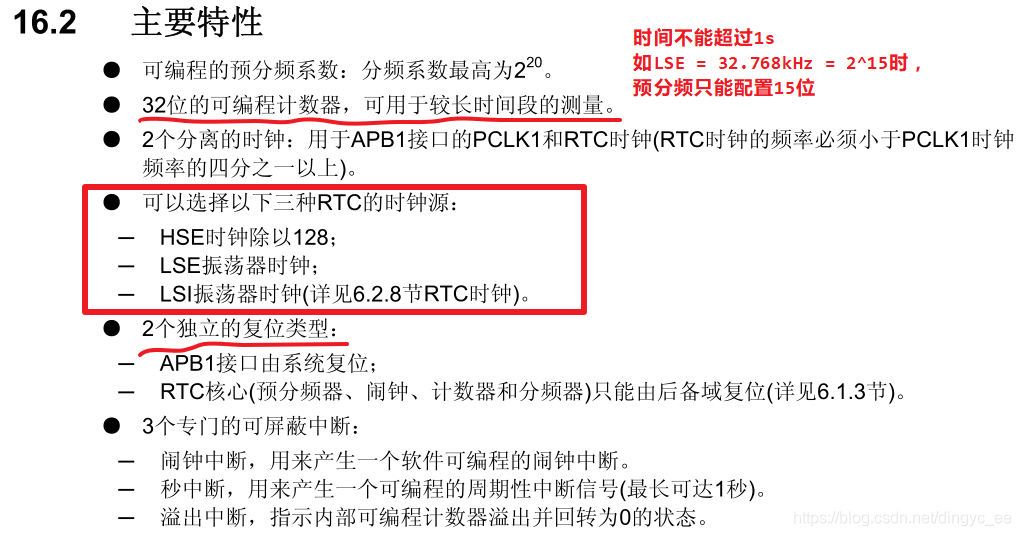 其实是对RTCCLK进行分频,比如RTCCLK为32768Hz,那最大可用的分频也就是(32767 + 1),此时计数频率 TR_CLK = 32768 / (32767 + 1)= 1Hz,计数时间为1秒。如果分频系数再增大,如设置为(49999 + 1),那么计数频率 TR_CLK = 32768 / ((49999 + 1)= 0.65536 Hz,这肯定出错。所以,TR_CLK最小为 1Hz,再小就成小数了。