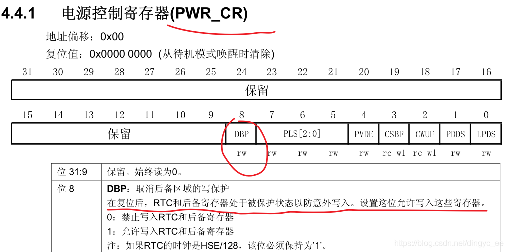 设置寄存器PWR_CR的DBP位,使能对后备寄存器和RTC的访问;