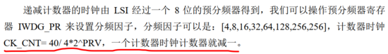 独立看门狗的时钟由独立的 RC 振荡器 LSI 提供, 即使主时钟发生故障它仍然有效,非常独立。 LSI 的频率一般在 30~60KHZ 之间,根据温度和工作场合会有一定的漂移,我们一般取 40KHZ,所以独立看门狗的定时时间并一定非常精确,只适用于对时间精度要求比较低的场合。