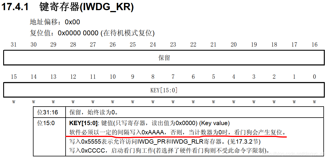 重装载寄存器是一个 12 位的寄存器,里面装着要刷新到计数器的值,这个值的大小决定着独立看门狗的溢出时间。
