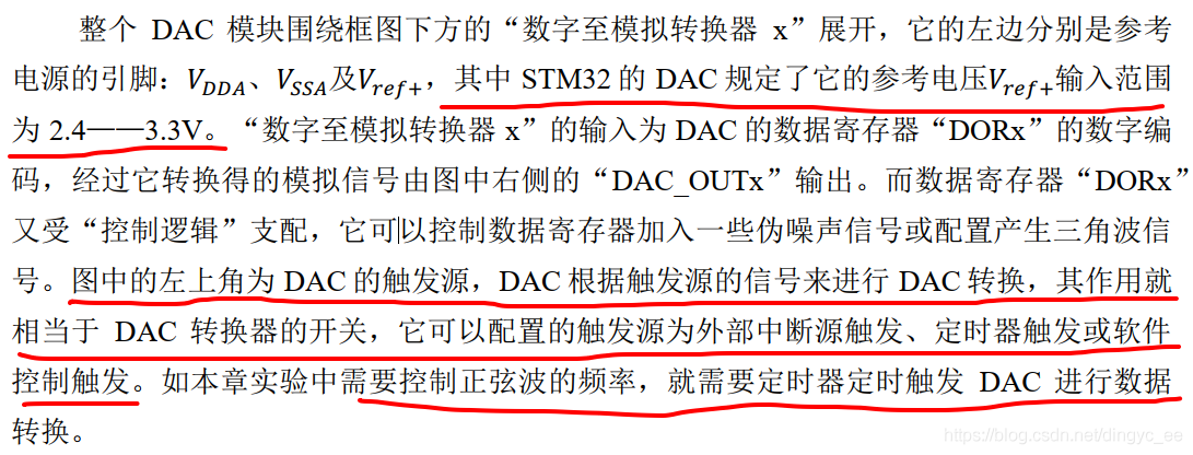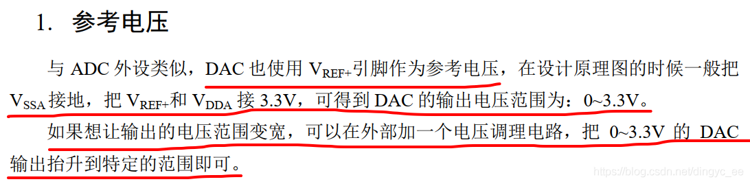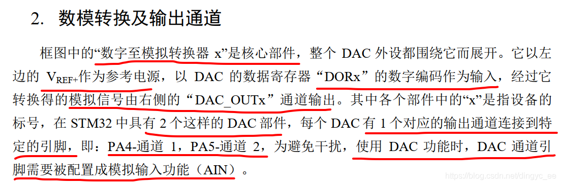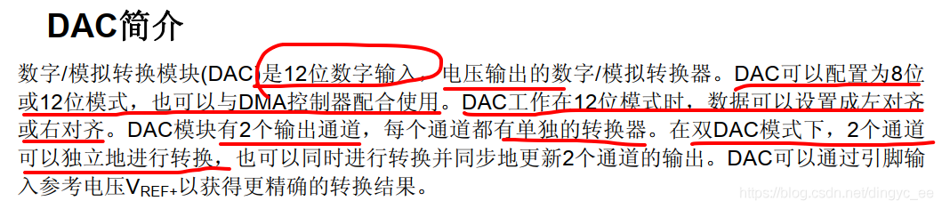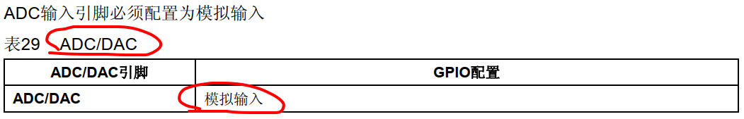 注意,在使用DAC时,GPIO引脚一定要配置成模拟输入,不然没有输出,中文参考手册的描述: