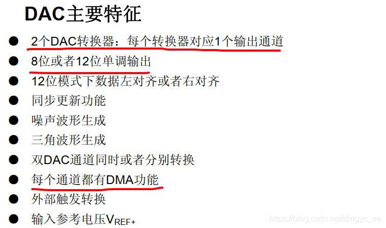 stm32只有2个DAC,每个DAC有1个独立的通道,这和ADC有区别(有3个ADC,每个ADC有16个通道),特征如下: