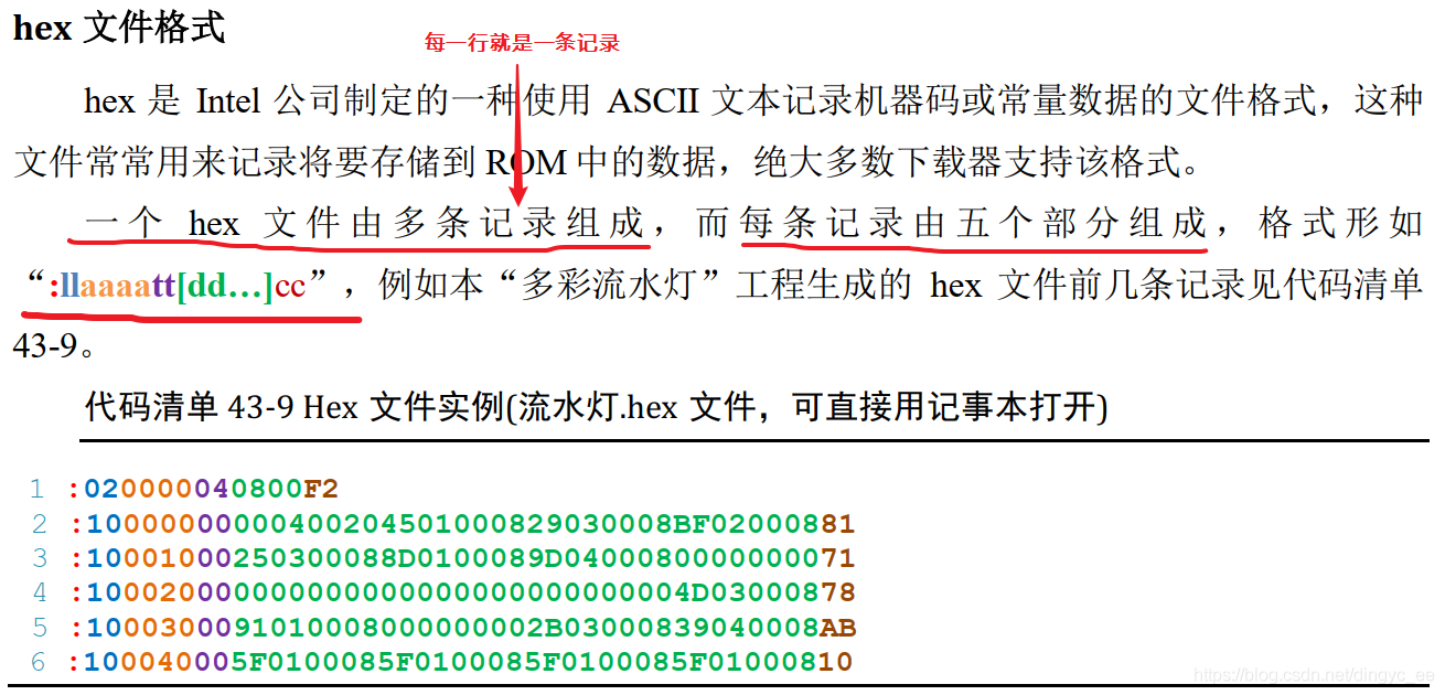 hex 是 Intel 公司制定的一种使用 ASCII 文本记录机器码或常量数据的文件格式,这种文件常常用来记录将要存储到 ROM 中的数据,绝大多数下载器支持该格式。