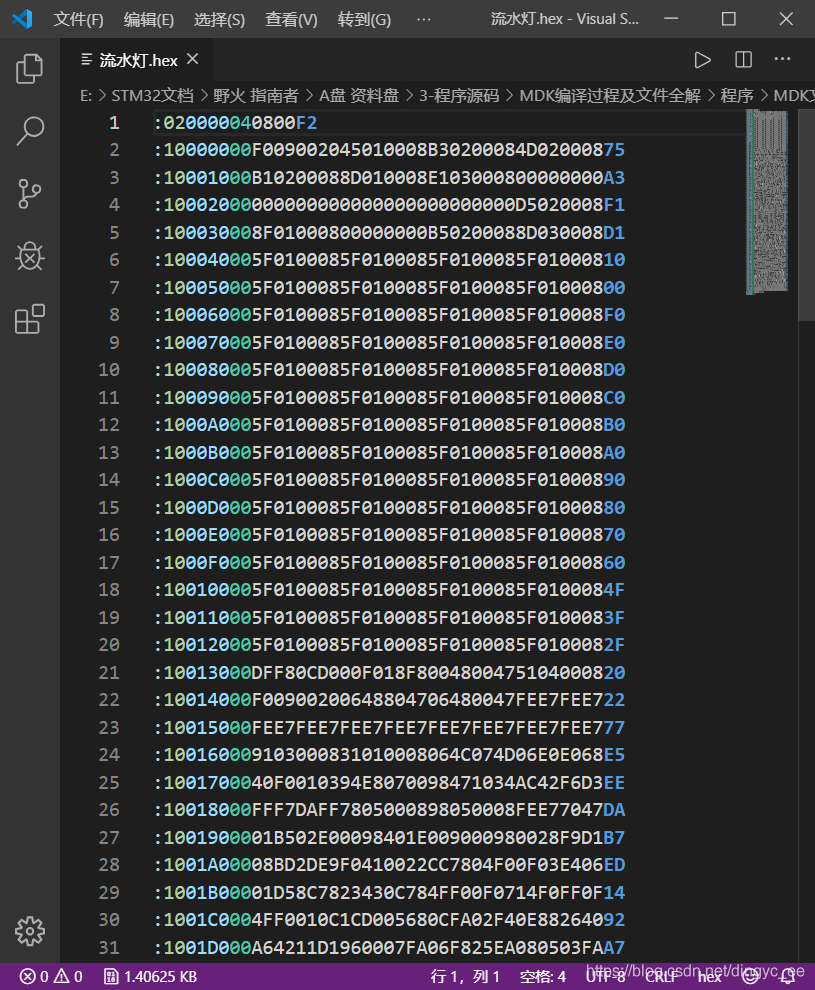 用vscode打开我们生成的hex文件如下,可以看到,与上述hex格式编码要求一致。