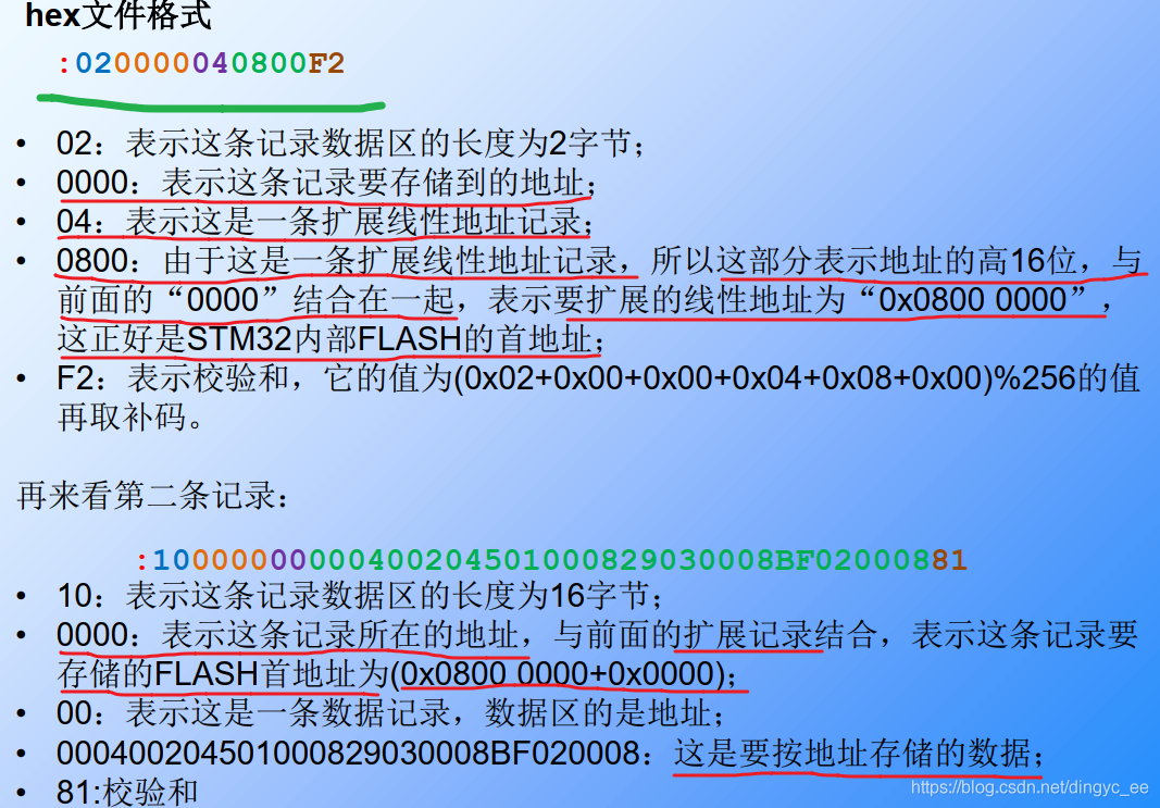 接下来,我们分析一下这几条hex文件的内容和意义: