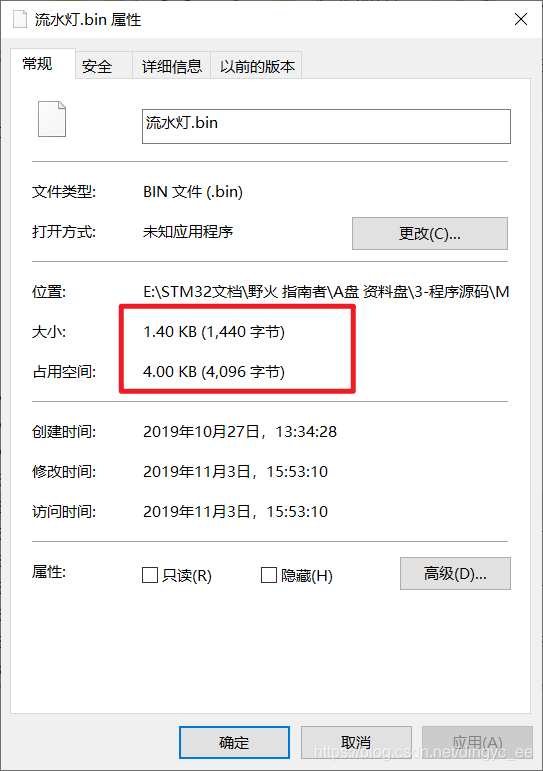 因为博主使用的windows系统,一个文件最小是4096字节,文件占用的空间都必须是4096的倍数。再进一步分析,为什么bin文件是1440字节?