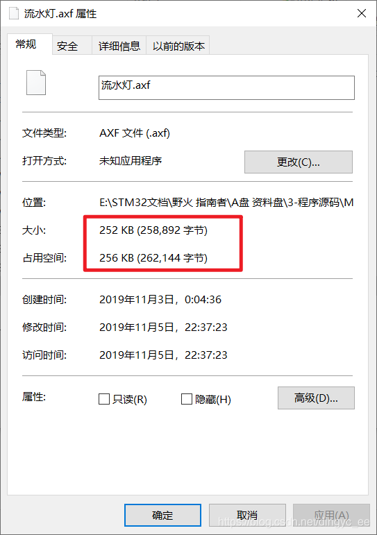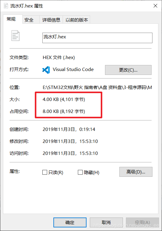 可以看到,hex的实际大小为4101字节(>4096),只比4096字节超出一点点。但windows使用的文件系统,就是会占用到