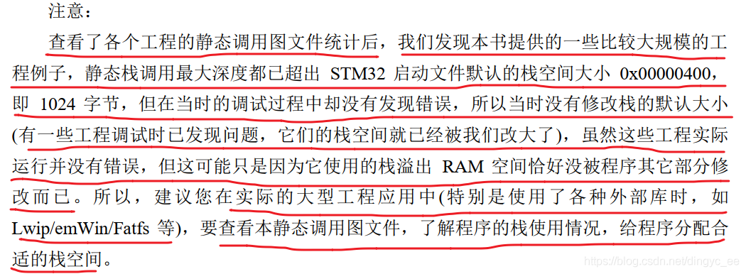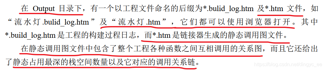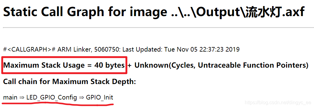 该文件说明了本工程的静态栈空间最大占用 40 字节(Maximum Stack Usage:40bytes),这个占用最深的静态调用为“ main->LED_GPIO_Config->GPIO_Init”。注意这里给出的空间只是静态的栈使用统计,链接器无法统计动态使用情况,例如链接器无法知道递归函数的递归深度。在本文件的后面还可查询到其它函数的调用情况及其它细节。利用这些信息,我们可以大致了解工程中应该分配多少空间给栈,有空间余量的情况下,一般会设置比这个静态最深栈使用量大一倍,在 STM32 中可修改启动文件改变堆栈的大小;如果空间不足,可从该文件中了解到调用深度的信息,然后优化该代码。
