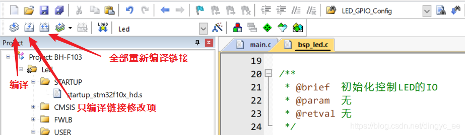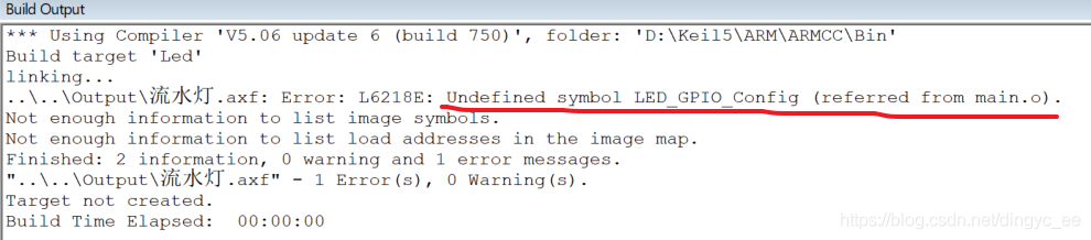 其实,我在写代码时,有时会经常遇到这个错误。它提示的是,在main.o中,没有找到引用的函数(符号)LED_GPIO_Config,实际上,main.o是main.c编译后生成的目标文件,这个目标文件引用的LED_GPIO_Config在所有的目标文件中都没有找到,因为我们把函数名修改成了LED_GPIO_Config0。找不到,那么自然就提示错误了。