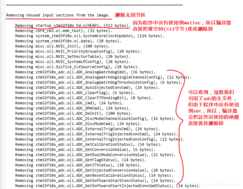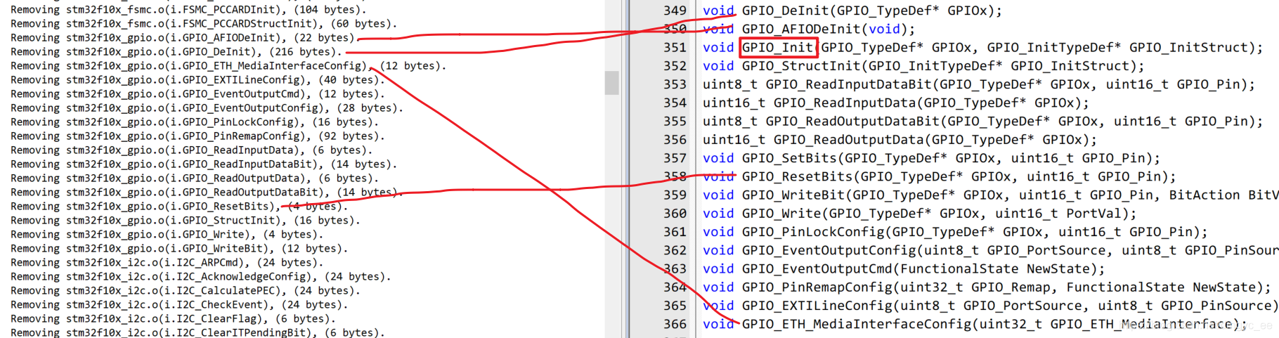 对比左右两边可以发现,我们在程序中调用过的GPIO_Init函数,没有出现在删除无用节区的列表中。而没有调用到的函数,被直接被删除掉以节省存储空间。