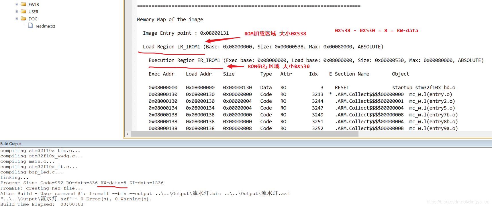 本工程的存储器映像索引分为 ER_IROM1 及 RW_IRAM1 部分,它们分别对应 STM32内部 FLASH 及 SRAM 的空间。相对于符号映像表,这个索引表描述的单位是节区,而且它描述的主要信息中包含了节区的类型及属性,由此可以区分 Code、 RO-data、 RW-data及 ZI-data。