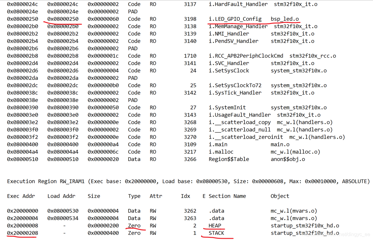 例如,从上面的表中我们可以看到 i.LED_GPIO_Config 节区存储在内部 FLASH 的0x08000250 地址,大小为 0x00000060,类型为 Code,属性为 RO。而程序的 STACK 节区(栈空间)存储在 SRAM 的 0x20000208 地址,大小为 0x00000400,类型为 Zero,属性为RW(即 RW-data) 。