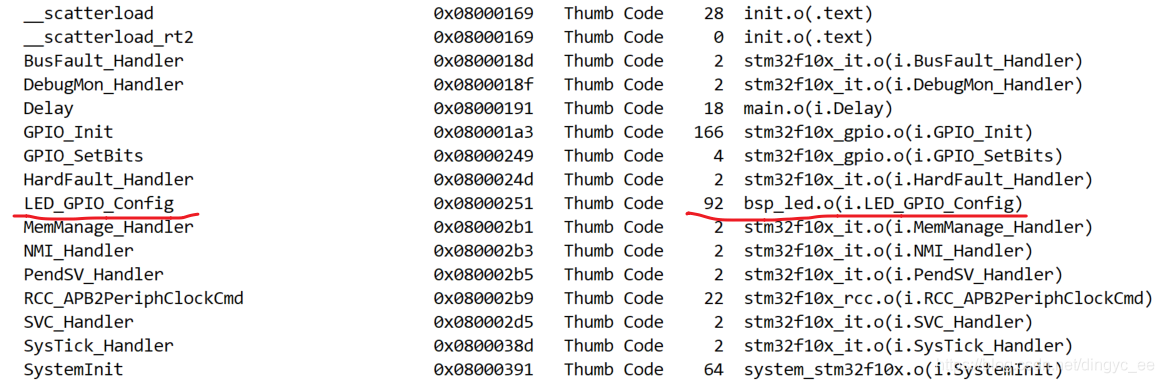 这个表列出了被引用的各个符号在存储器中的具体地址、占据的空间大小等信息。如我们可以查到 LED_GPIO_Config 符号存储在 0x08000251 地址,它属于 Thumb Code 类型,大小为 92 字节,它所在的节区为 bsp_led.o 文件的 i.LED_GPIO_Config 节区。