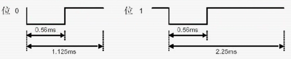 由上图可区分,位0和位1;位0和位1的低电平时间相同,高电平时间不同,位0高电平持续时间为0.56ms,位1高电平时间为1.69ms,但也不是绝对的,如位0高电平持续时间在0.56ms上下浮动,故而取0.56~1.69ms中间值,1ms.