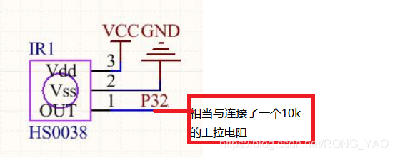 该电路是集成的,红外接收头的输出管脚接至单片机 P32 管脚上,为了保证红外接收头输出管脚默认为高电平,需外接一个上拉电阻,同 样的与单片机 IO 口连接就相当于外接了 10K 上拉电阻。 由于该模块电路是集成的,所以红外接收头的输出管脚与单片机 P32 管脚连接使用即可。