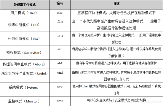 处理器模式可以通过软件控制切换,也可以通过外部中断或异常处理过程进行切换。