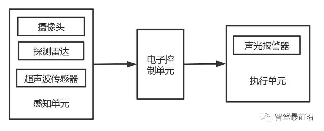 盲点监测系统主要是由感知单元、电子控制单元及执行单元组成,感知单元包括摄像头、探测雷达、超声波传感器,执行单元为声光报警器。感知单元主要用来监测车辆侧后方盲区中是否存在车辆或行人,并将感知信息传递给电子控制单元;电子控制单元将感知单元获取的信息进行处理及判断,并将处理后的信号输出给执行单元;执行单元的主要作用是执行电子控制单元的指令,如果盲区存在车辆或行人,声光报警器会通过图像或者声音的方式,给驾驶员进行提示,让驾驶员得到更好的驾驶预判。