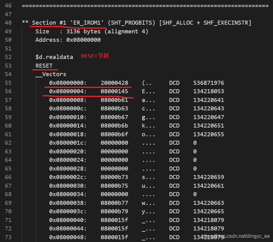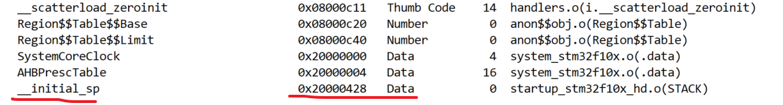 0x08000145,查看 map 文件,这两个值正好是栈顶地址__initial_sp 以及首条指令 Reset_Handler 的地址。下载器会根据 axf 文