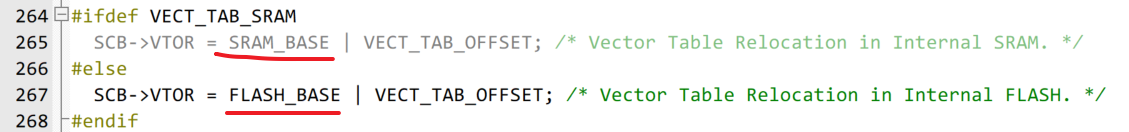 其中,值得注意的是这一块,根据是否定义宏VECT_TAB_SRAM,来设置VTOR的偏移地址是基于SRAM还是FLASH。