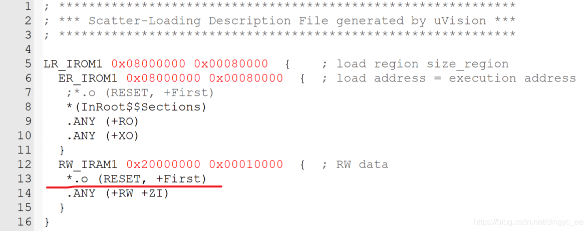 那么加入我们把*.o(RESET, +First)语句放到RW_IRAM1中,__initial_sp 和 Reset_Handler就会被存储到0X2000 0000和
