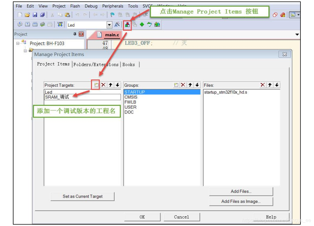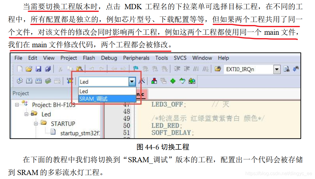 由于 startup_stm32f10x.s 文件中的启动代码不是指定到绝对地址的,经过它由链接器决定应存储到内部 FLASH 还是 SRAM,所以 SRAM 版本工程中的启动文件不需要作任何修改。