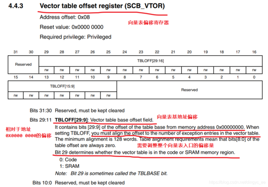 重点在于启动文件定义的中断向量表被存储到内部 FLASH 和内部 SRAM 时,这两种情况对内核的影响是不同的,内核会根据它的“向量表偏移寄存器 VTOR”配置来获取向量表,即中断服务函数的入口。我们来看一下关于VTOR寄存器的描述: