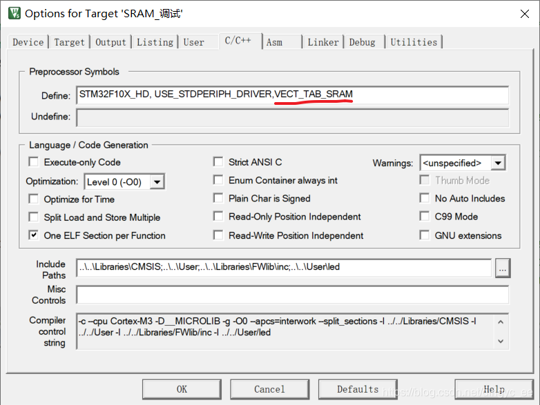 那么,我们可以在SRAM调试的工程配置中加入VECT_TAB_SRAM宏(正常版本中没有),来进行向量表偏移: