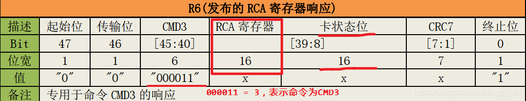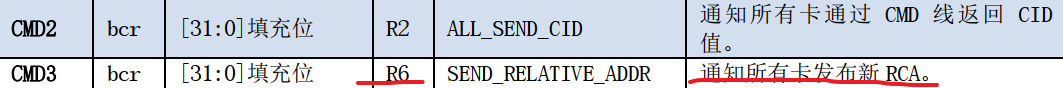 当发送CMD2命令后,会返回CID值(128位),这个128位标识符太长,可以通过CMD3命令,通知所有卡发布新RCA(16位)来区分系统上有几张卡(总线上的卡通信后会知道总线上有多少张卡,然后协调并自动分配每张卡的RCA标识符),返回类型为R6,如下所示: