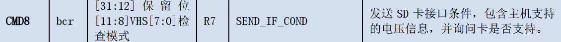 CMD8命令,发送SD卡的接口条件,如果SD卡认为这是正常的电压,则返回R7类型;