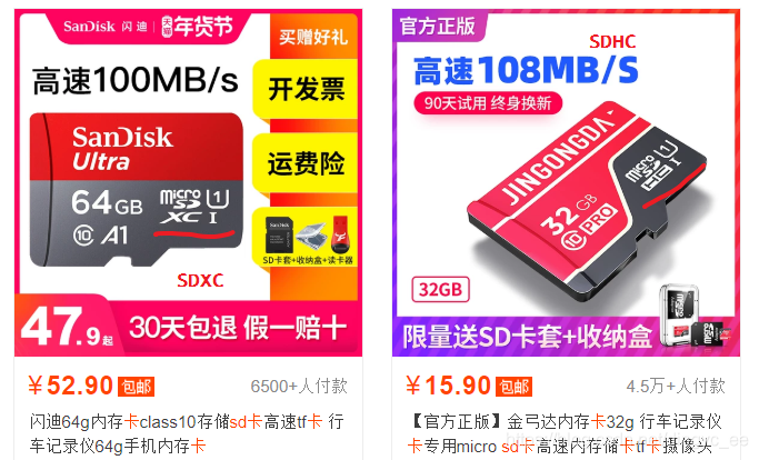 如下图所示(左边64GB为超大容量 SDXC,右边32GB为大容量 SDHC):