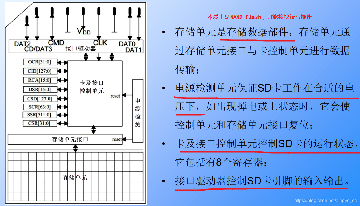 一张SD卡包括有存储单元、存储单元接口、电源检测、卡及接口控制器和接口驱动器5个部分。