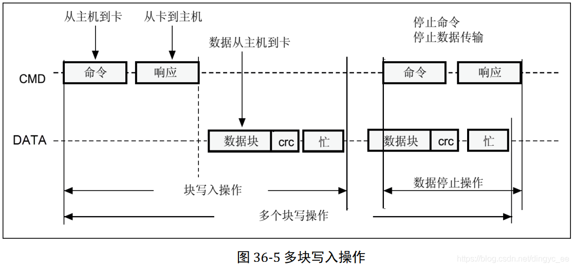 SD 数据传输支持单块和多块读写,它们分别对应不同的操作命令,多块写入还需要使用命令来停止整个写入操作。数据写入前需要检测 SD 卡忙状态,因为 SD 卡在接收到数据后编程到存储区过程需要一定操作时间, SD卡忙状态通过把 D0 线拉低表示。
