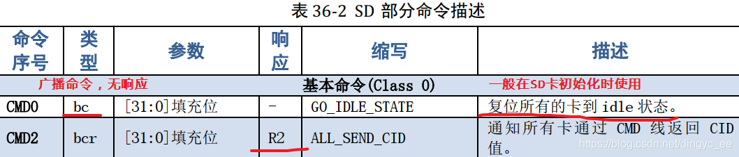 如上所示,CMD0命令,类型为无响应广播命令,复位所有卡到空闲状态;