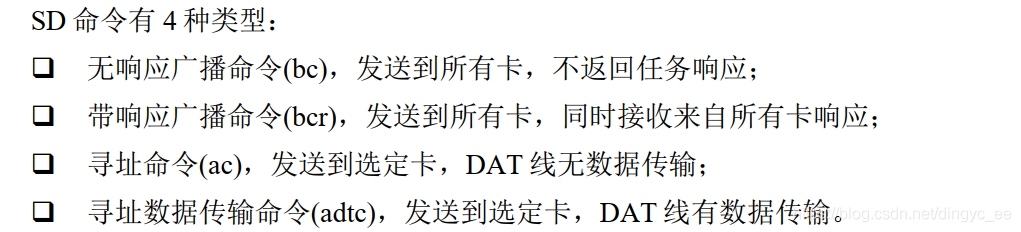 SD 命令由主机发出,以广播命令和寻址命令为例,广播命令是针对与 SD 主机总线连接的所有从设备发送的,寻址命令是指定某个地址设备进行命令传输。