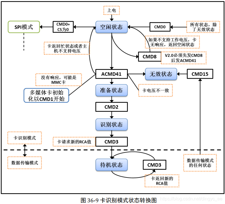 d 循环发送 SDIO 支持的电压范围,发送一定次数。如果一直没有应答,说明供电电压不支持,如果没有超出循环次数,说明 SD 卡初始化正常,根据响应值判断SD卡表标准容量还是高容量类型;