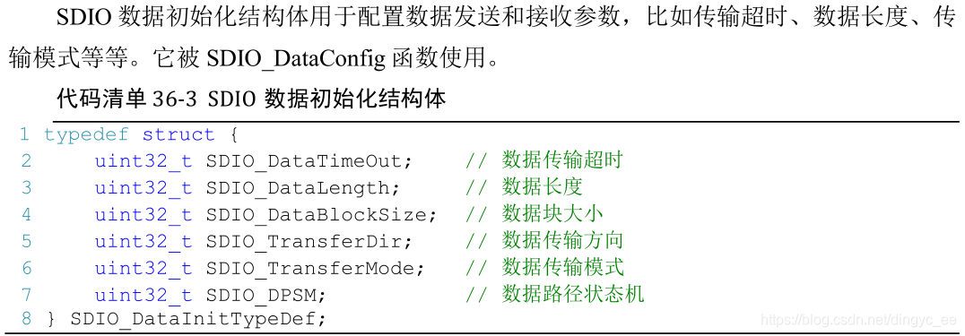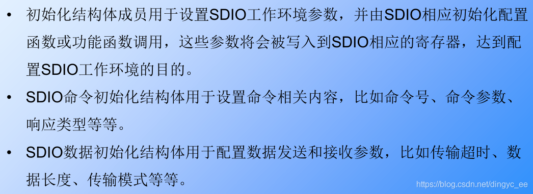 stm32标准库对 SDIO 外设建立了 3 个结构体,分别为 SDIO 初始化结构体 SDIO_InitTypeDef ,SDIO 命令初始化结构体 SDIO_CmdInitTypeDef 和 SDIO 数据初始化结构体 SDIO_DataInitTypeDef 。
