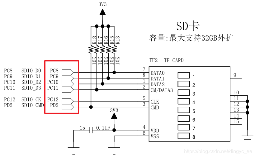 1 SD卡 原理图(使用到stm32的6个引脚)