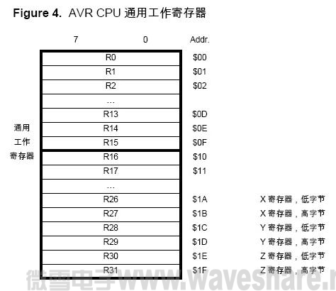如Figure 4 所示,每个寄存器都有一个数据内存地址,将他们直接映射到用户数据空间的 头32 个地址。虽然寄存器文件的物理实现不是SRAM,这种内存组织方式在访问寄存器 方面具有极大的灵活性,因为X、Y、Z 寄存器可以设置为指向任意寄存器的指针。